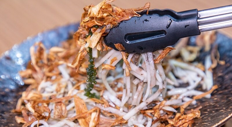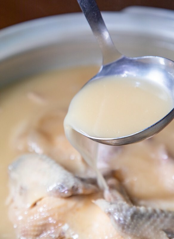 豬肋和去芯的紅白蘿蔔邱家兄弟的五鬚蝦還有埔里香菇煮八個小時過篩靜置一晚,隔天載和洋蔥蘿蔔五鬚蝦埔里香菇日本竹葉蛋白煮六小時直到顏色澄清如茶色清澈,帶著肉粽的香氣。並且一百公克只有八大卡超級低熱量。