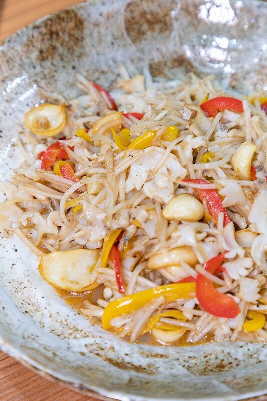 竹炭絲瓜是老朋友了,第一次來的朋友多數會被它的創意和對比的口感驚豔,但邁議這道料理上桌馬上吃,晚一秒絲瓜的水份就少一份,吃在嘴裡的甜度也少了一份,外層的竹炭麵食也會越來越沒有口感。強調一下,別看它很簡單,可是用台南網室絲瓜、洲南鹽廠海鹽跟日本竹炭粉德國氣泡水調成的。