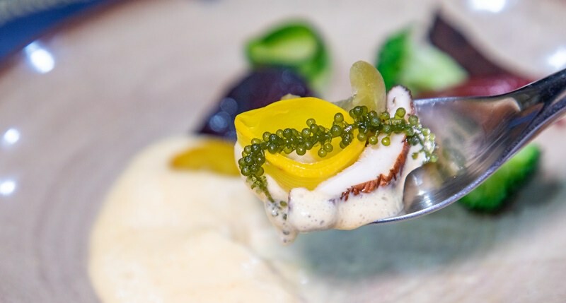 溫熱有機沙拉/情人果/氮氣蛋黃醬,蛋黃醬依舊是大家熟悉的問題,但卻有一抹另類清爽的風味,猜想也許來自酸v的情人果,當中的食材甚多,比較有亮點的是視覺上的海葡萄、炭烤過的香菇及甜菜根,但純以味覺來說,黃瓜又和蛋黃醬更是契合。