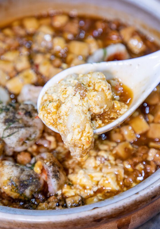 麻婆豆腐的底下是一層用純鮮奶油跟金盞花雞蛋去做成烤布蕾,口感像蒸蛋、茶碗蒸,又像布丁。更特別的是上面的麻婆豆腐除了用郫縣豆瓣和雞蛋豆腐外,還加入雞湯去煨,讓這一鍋的每一口都有著絕妙的綿化口感,油香麻鹹辣甜,還帶著微妙的奶油氣息,真真正正好吃得亂八九糟,至於那炭烤虎斑蝦 只是錦上添花的可有可無,光是這麻婆豆腐布蕾就可以單獨拿出來賣。順便說一下,上面的蒔蘿下的好,有點睛和改變膩口的優點,卻也有人認為太強擾味就是。