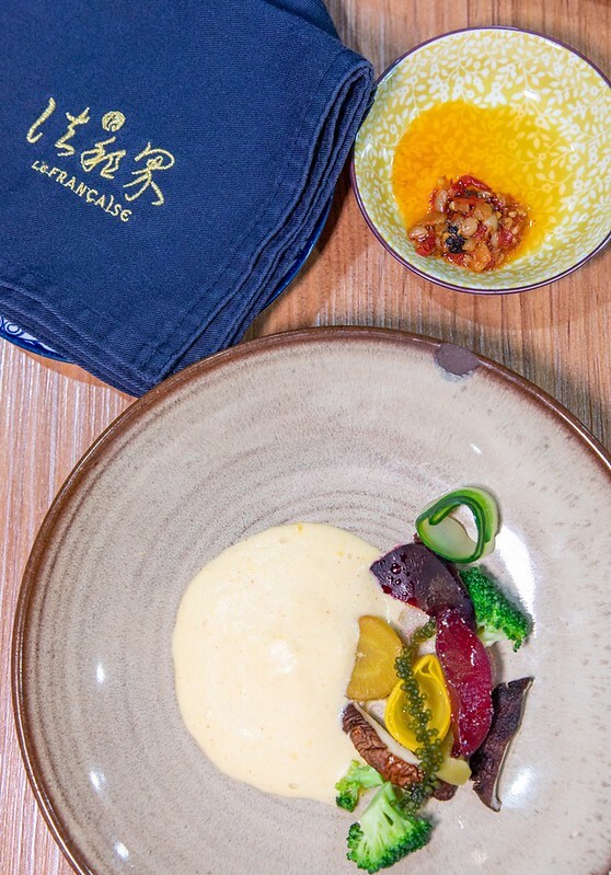 邱家兄弟紅衫鰭鯧蘑菇鱈魚肝,也許是以前鯧魚多半用煎的,或是紅衫鰭鯧本身就精彩,用紙包魚的做法讓這盤去骨頭去魚的鯧魚變得非常的細嫩軟糯,更精彩的是鯧魚之上,三種菇和鱈魚肝及桂花釀做成菇泥,鯧魚的魚肉和菇泥一口吃下,那化口、那綿密完全顛覆過往魚料理的口感,菇甜和魚鮮的完全結合,再次印證主廚無窮無盡的料理創意才是法租界的無價之寶。