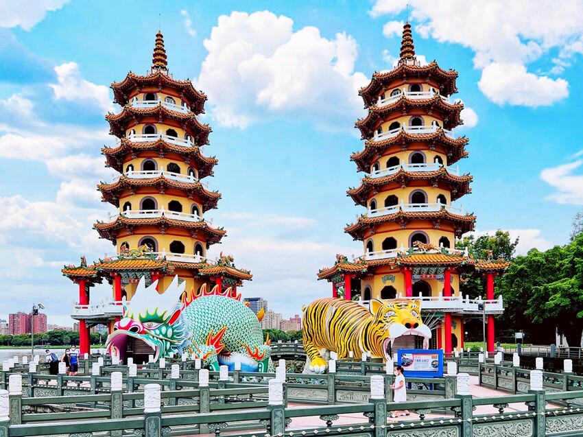 龍虎塔雙塔的塔高七層樓,在樓前各有一龍一虎塑像,遊客可以由龍口進,虎口出,取其吉祥之意。而塔身與岸邊有九曲橋銜接與潭面相互對應,在這拍照打卡真的很不錯,但可惜這次來訪無法龍虎塔的出入口都關上門,也就無法到塔內欣賞一番。