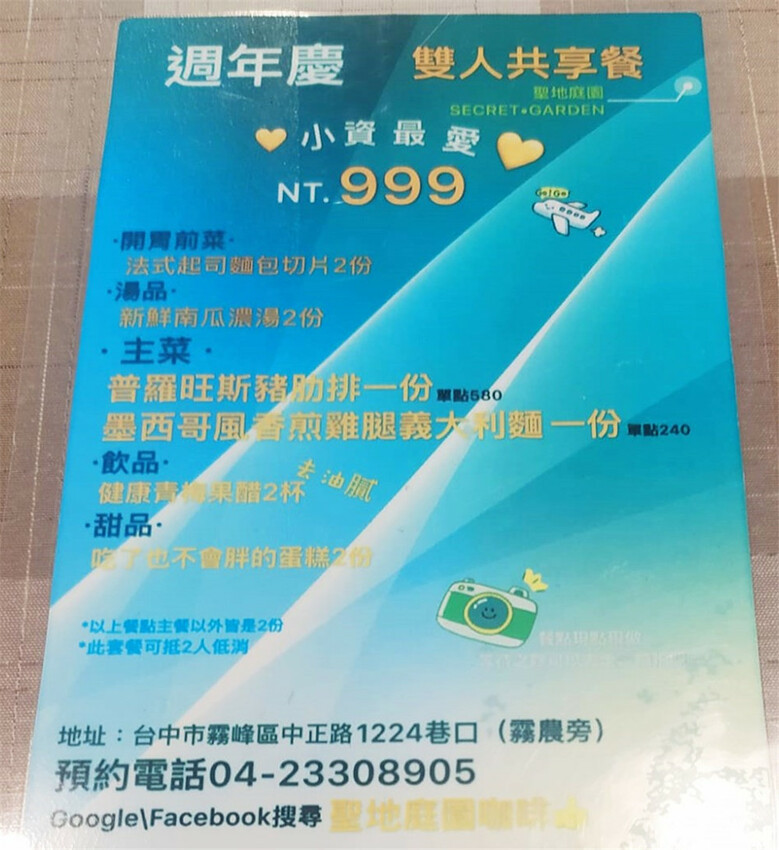 包括開胃前菜,湯品,主菜,飲品和甜點,都是二人份,價格看起來似乎挺划算