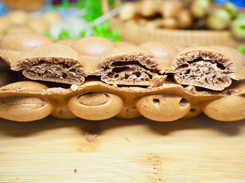 傳統的雞蛋仔,烤製出整片有如蜂巢般獨特的造型,雞蛋仔呈現金黃色,每一顆吃起來外酥內軟。