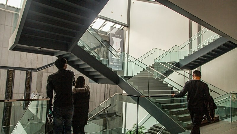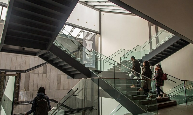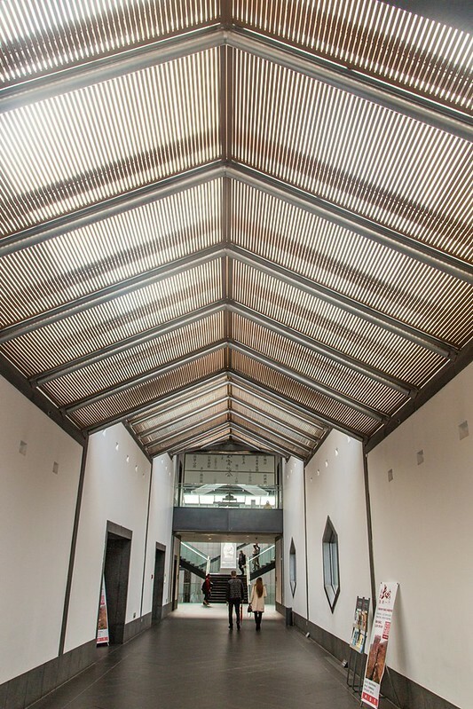 同行的幾位建築系友人,對著交錯的梯子、玻璃,清水模石牆品頭論足,尤為感概的是整座博物館的採光,完全不懂建築的我只能跟著點頭如搗蒜。