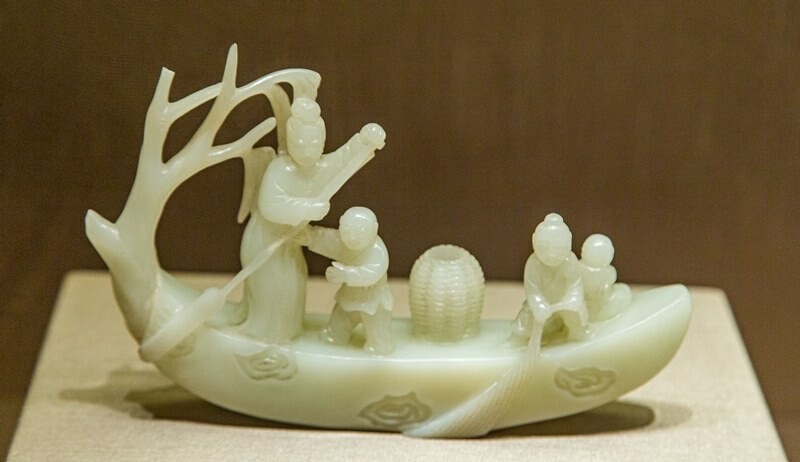 蘇州博物館中有不少玉器的收藏,以「和闐白玉」雕成的「人物玉船」便有好幾件,這些精美的玉器推估為清朝時期的作品,整塊和闐玉(崑崙玉,原產西域莎車國、于闐國)雕成。因為闐玉是一種軟玉,特別適合精雕細琢,特色為玉色乳白,有黃色沁斑。