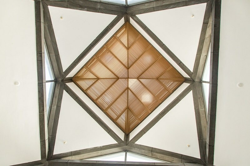 屋頂的設計有貝聿銘一貫的幾何圖形,鋼結構、塗料組成的頂棚,金屬遮陽片和懷舊的木作(竹子),適度調節了太陽光的強度和角度,天氣好時這些或折射、或穿透的自然照明,就像牽引著訪客一步一步解開蘇州博物館的前世今生之謎。不知道為何什麼,我一直覺得這屋頂有一點像機動戰士的臉...。