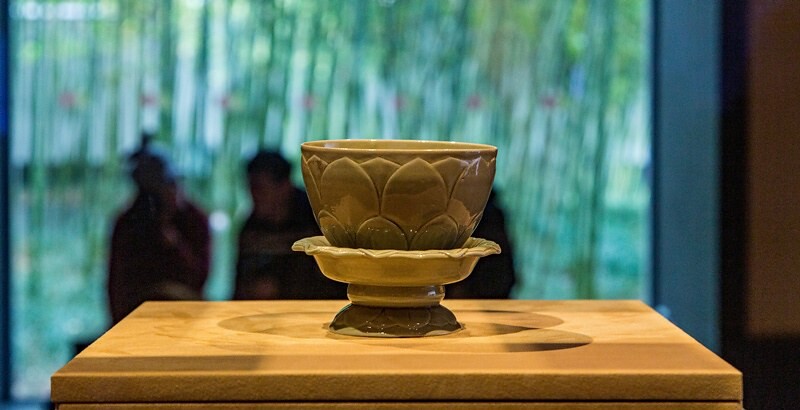 秘色瓷蓮花碗(五代) 為蘇州鎮館三寶之一,1956年維修蘇虎丘雲岩寺塔時發現,屬越窯青瓷(唐朝、五代時浙江紹興越州的瓷窯)的極品,是平常老百姓不得使用的官窯青瓷。蓮花碗由碗和盞託兩部分組成。碗為直口深腹,外壁飾浮雕蓮花三組,那翠、墨綠間的青色無暇的讓人驚嘆,即便我一點也不懂瓷器。