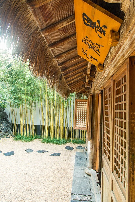 這座山水園隔北牆特別值得一看,貝聿銘「以壁為紙,以石為繪」的設計概念,在牆上以片石假山的畫出一幅真假難辨的潑墨似的國畫,這讓我想念了日本島根足利美術館的「枯山水庭」。