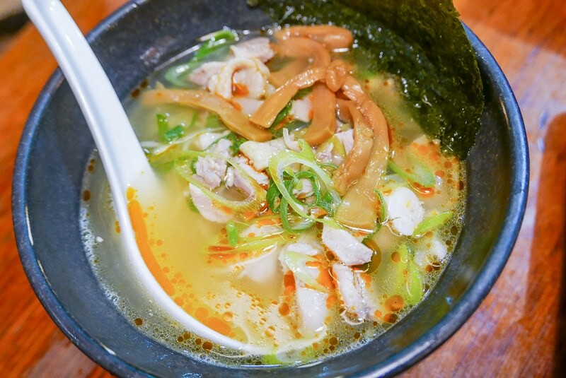 魚介雞湯拉麵,湯頭色澤比一般的魚介來的淡些,這興許是因為加了雞湯的關系,喝起來卻濃厚的像是豚骨,當然我指的是口感。魚介過往會太鹹的缺點,被雞湯給柔合了,雖然雞湯的油香感覺也被拉掉了,但喝將上來仍算是好喝,有一點像在喝沾完麵加了湯的沾麵湯。算魚介、算雞湯?也許是一種新的魚介雞湯,印象中我在日本也只吃過這家是魚介加雞湯。