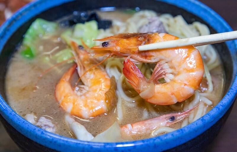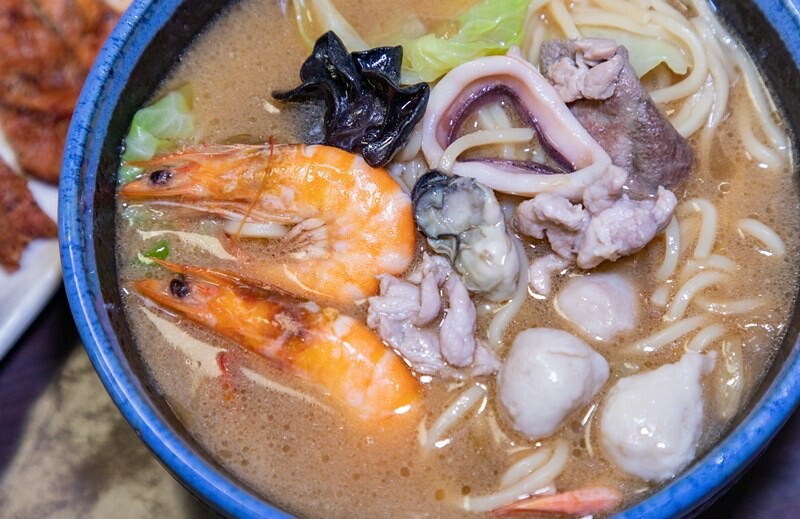 這一碗食材很是豐富,光是蝦子就有三四隻,其中的兩隻個頭不小,還有蚵仔、花枝、魚丸、鳥蛋、豬肉、肉片、木耳和大量的蔬菜。