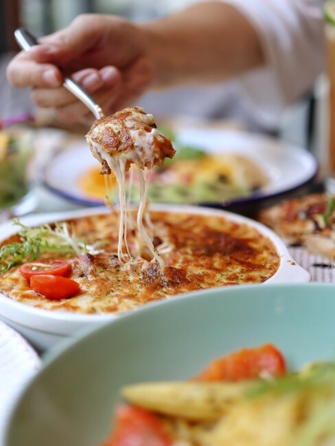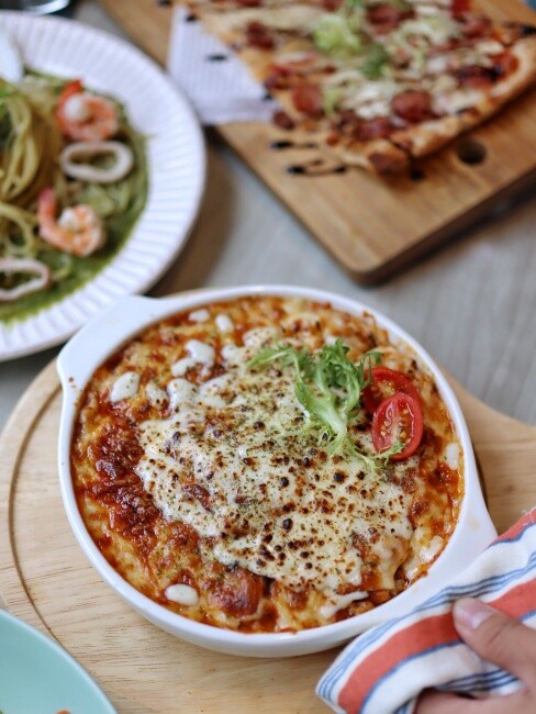 ◆ 新品焗烤飯太誘人了吧~ 上面鋪滿厚厚的起司,烤到金黃微焦的表面、用湯匙挖下,拉出長長的牽絲,兼顧視覺與味覺、濃郁的起司香氣好邪惡內,裡面的牛肉塊滿軟嫩的,混合番茄調味相當開胃喔。喜歡薄脆口感比薩看過來,這家的手工餅皮酥酥脆脆,搭配彈脆的德腸跟起司,淋上巴沙米可醋醬口感很豐富喔。