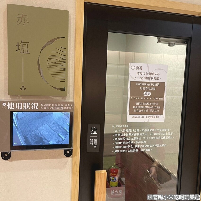 每一間岩盤浴門口有溫度顯示,大家可以從最低溫的開始囉。