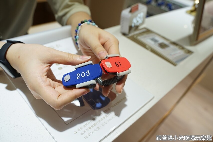 置物櫃的鑰匙,上面的號碼除了是置物櫃對應的數字之外,在加入LINE會員時,輸入這組號碼就可以知道離場時間,超時可是要加錢唷 XD
