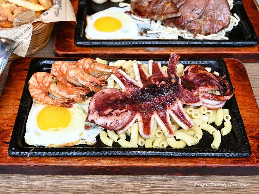 喜歡吃海鮮的朋友可以試試成功牛排大明店這道深海五味中卷加草蝦,一次吃到兩種海鮮,中卷一整隻附上超霸氣,直接佔據了半個鐵板,口感Q嫩彈牙,鮮味十足,一整隻拿起來吃超過癮
