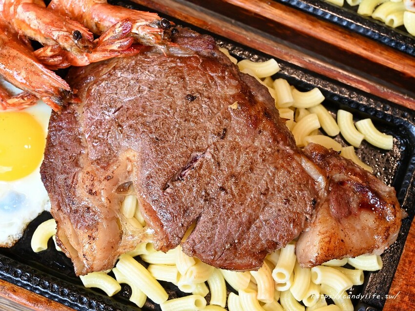 比起剛剛的沙朗牛排,這塊美國肋眼牛排更大塊也更厚實,糖糖搭配香煎草蝦及外面牛排館比較少見的通心麵,份量看起來也蠻大一份的