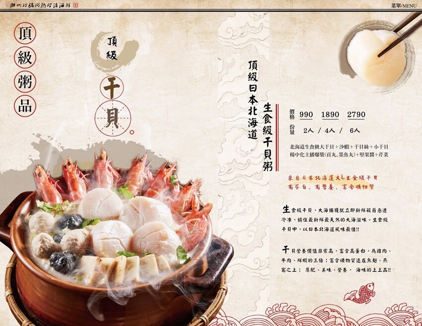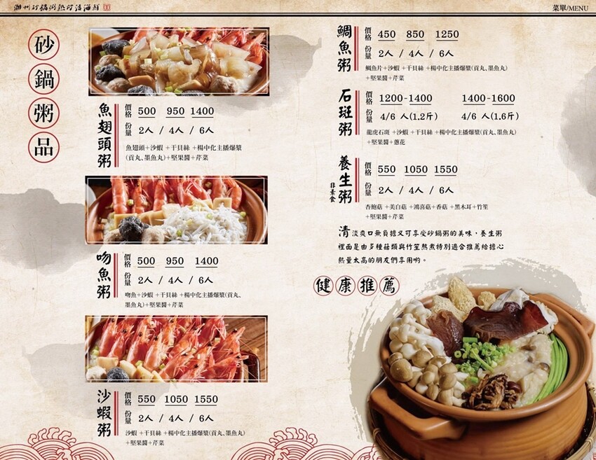 ▼菜單,除了有砂鍋粥之外還有不少熱炒、活海鮮等菜色,選擇多元又豐富!(詳細菜單置於文末)