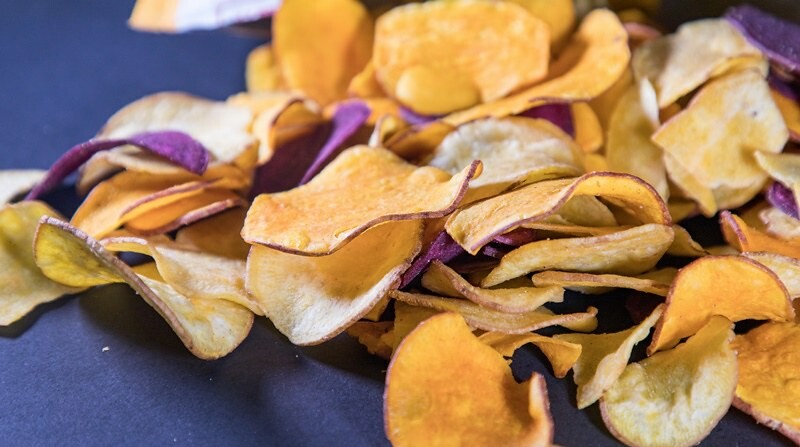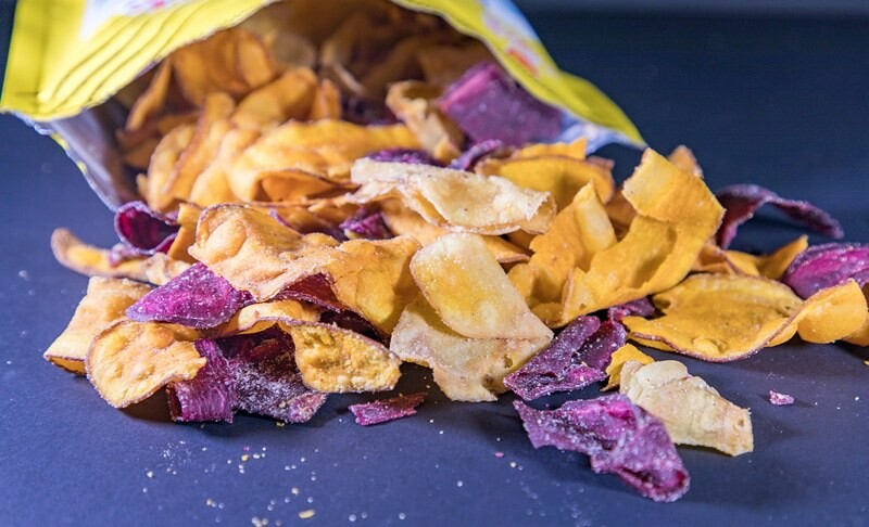 健司纖三薯脆片(好市多):400公克/309元(每公克0.77元),食材標示為台農57號地瓜、台農66號橘地瓜、台農73號紫地瓜。低油真空油炸。
