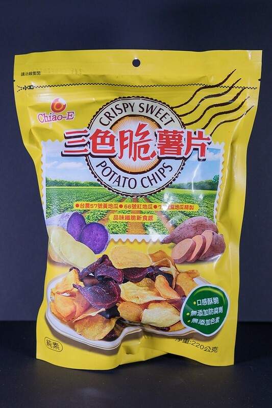 chiao-E三色脆薯片(三小美日):220公克/98元(每公克0.44元),食材標示為台農57號黃地瓜.66號紅地瓜.73號紫地瓜。包裝無特別標示。