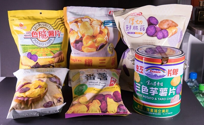 另外健司纖三薯脆片、卡迪娜厚切鮮脆藷、chiao-E厚切鮮脆藷三種都是有夾鏈帶的較大包裝。而全家雙色脆薯、卡滋雙色脆薯則和一般的洋芋片包裝差不多,比較偏向獨享包。
