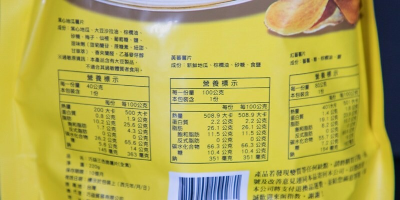 卡滋雙色蕃薯脆片:熱量496大卡、含納136毫克、含糖9.7公克、碳水化合物68公克。