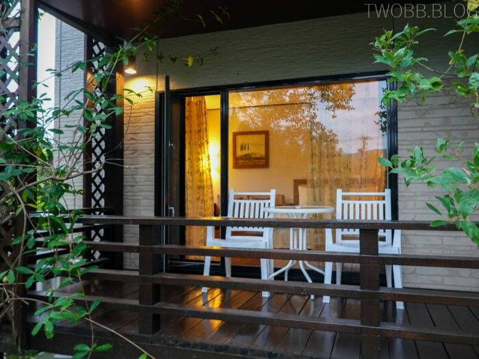 周邊就是池塘樹木植栽,民宿也有準備電蚊香防蚊蟲叮咬。Mini bar該有的礦泉水、茶葉與咖啡都沒有少,還有小朋友愛吃的餅乾,馬上就被妮姊拿到陽台一邊欣賞美景一邊吞下肚!