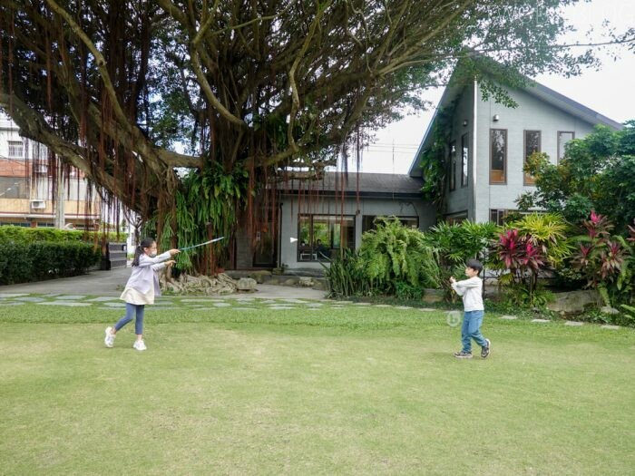 看到這麼大片的草地有沒有很想奔跑一下!一旁的遊樂器具都能提供借用,看到他們姊弟玩的這麼開心,被叢樹綠地包圍之下,來到這裡時間一下子就偷偷溜走。