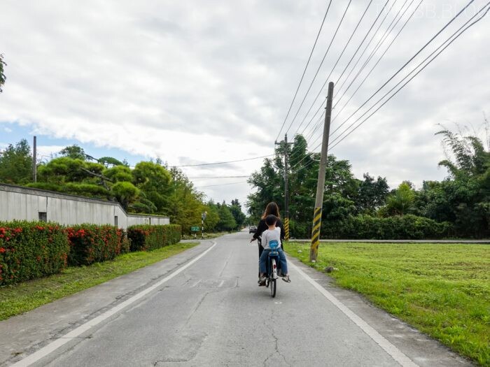 民宿老闆熱情地跟我們說,民宿提供自行車出借,沿著他們的地圖可以徜徉在綠色隧道,會騎自行車的妮姊相當興奮開始挑選,肉腳叡哥自己騎個幾趟就完全不行了,後續只能由媽媽我來載著跑。