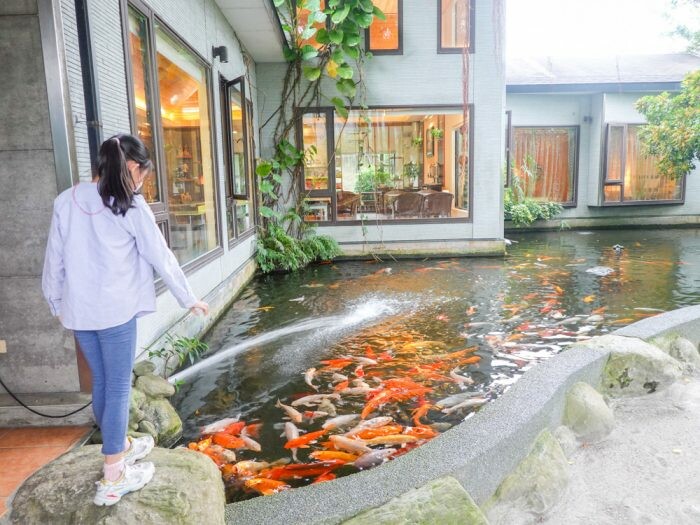 不要忘了向服務人員索取專門的魚飼料,享受一下餵魚的樂趣,鯉魚們也好捧場,看見我們拿著飼料過來,每一隻都張大嘴等著入口。