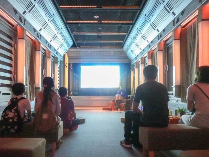 i-Ride 飛行劇院每季更換一次播放主題,從先前「進擊的巨人」及「飛越臺灣」,一直到現在的「阿拉丁」及「飛越千年中亞」,可以窺見風格大不相同,滿足不同年齡層的族群,每部片都能帶來不同的震撼體驗。還沒進場前,場外的宣傳影片就相當吸引這兩位,迫不及待想要進場翱翔俯視美景。