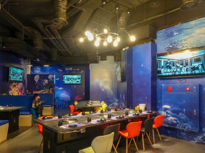 以藍色深海為主題,店家整體都以大海沉浸式設計,如同在水中的潛水艇,與水母及深海動物一同悠游。
