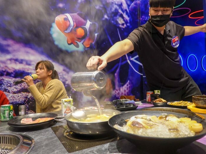 有沒有在KTV唱歌,服務生入內服務的既視感!在這裡卻是進來加火鍋湯,燒肉加歡唱的想法真的太有創意了!