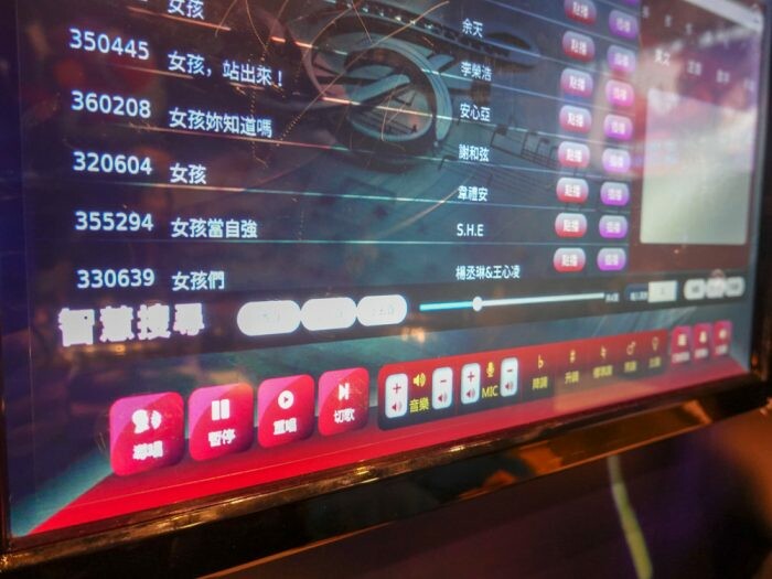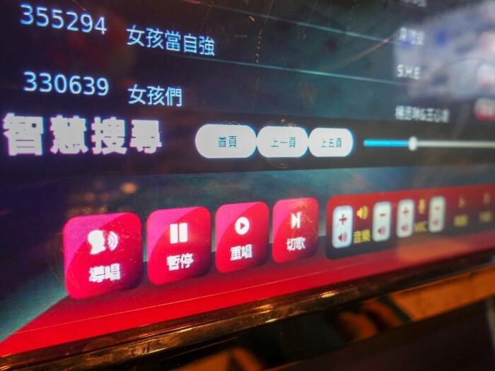 除了歌本點歌,當然還有點歌機台。操作模式完全與KTV一模一樣,帶著歡唱初體驗的妮叡姊弟,媽媽我露出驕傲的表情:「哼!想當年媽媽也是很愛跑KTV唱歌的!第一次看到這種新奇的東西吧!」