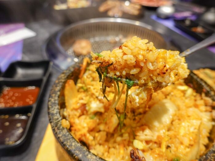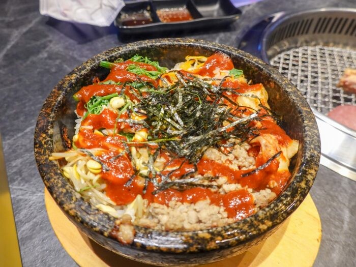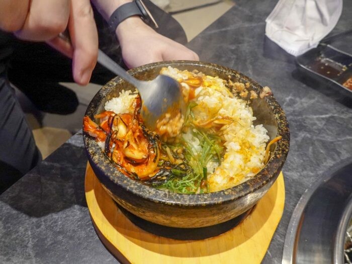 服務人員端著燒騰騰的石鍋拌飯進來,攪拌後香氣馬上竄入空氣中,除了燒肉香加上石鍋拌飯,都忘記要高歌了!