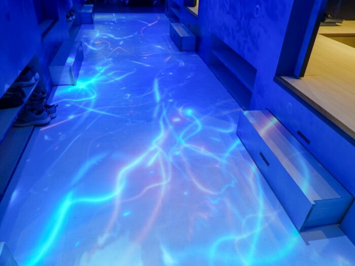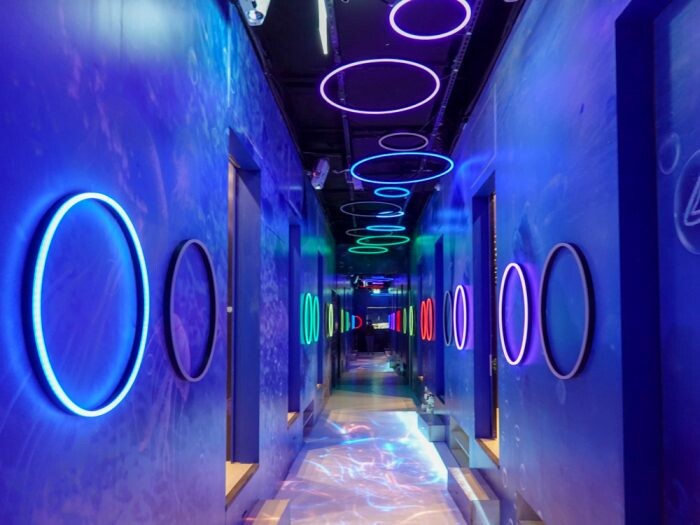 走道互動式的絢爛特效設計,更增加科幻迷濛的效果。