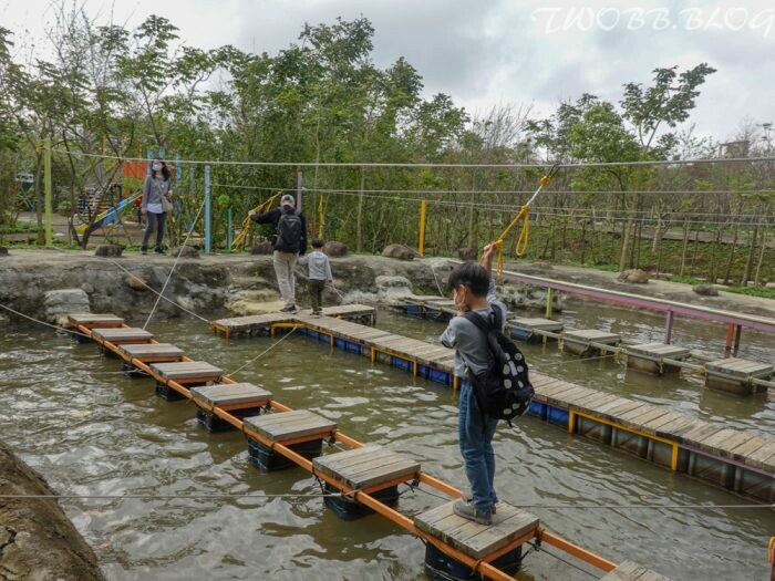 看起來簡單的獨木橋其實不簡單喔,搖搖晃晃的獨木橋,想過關除了具有相當足夠的平衡力外,整條設計不同高低造型的木階,算是很有挑戰性的關卡。