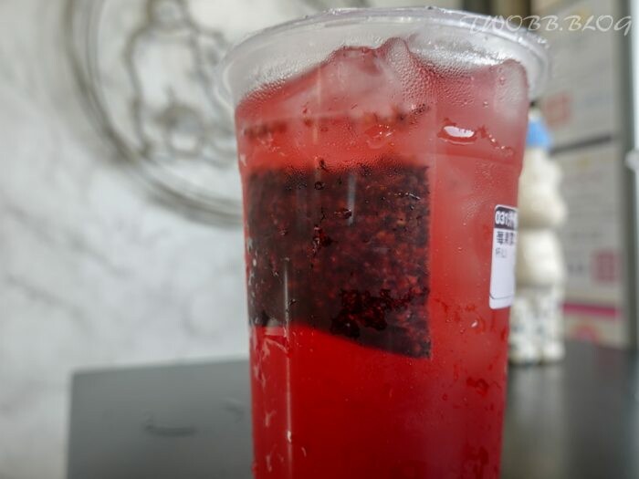 完整茶包直接浸泡於飲品中,每一口都能喝到蔓越莓濃厚果茶香,我們選擇剛剛好的半糖,與冰塊一起中和果茶酸味,不只清涼消暑還能解膩,適合配上一包炸物(誤)!