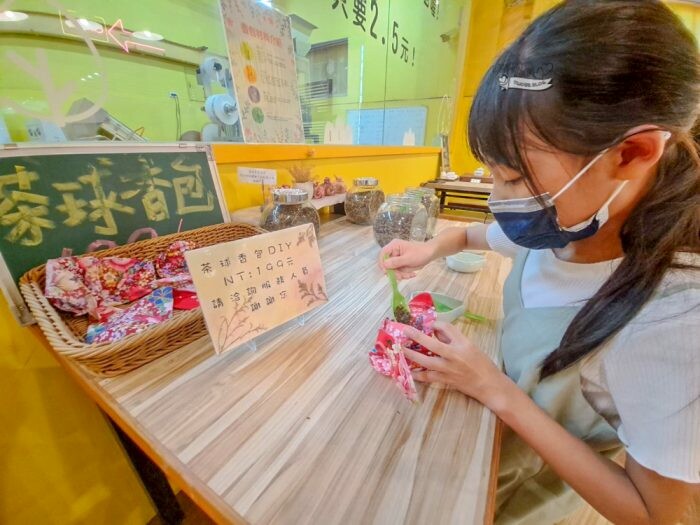 接著將茶葉放入茶巾後,依照服務人員的指導打結後就完成一顆可愛的茶包囉。
