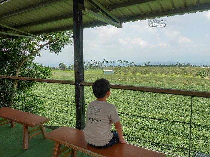 高處由下俯視的茶園令人感到舒心,天氣雖熱但熱不進心中,坐著體會心靜自然涼。