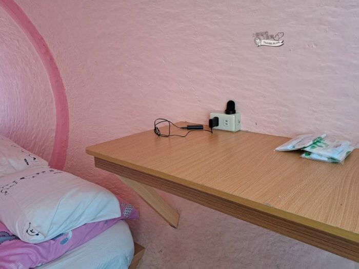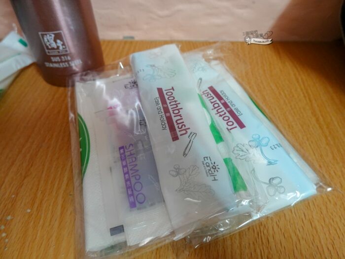 家庭房裡頭簡單配置一處置物桌,也有簡易的備品如牙刷、沐浴乳、洗髮乳及一次性毛巾。