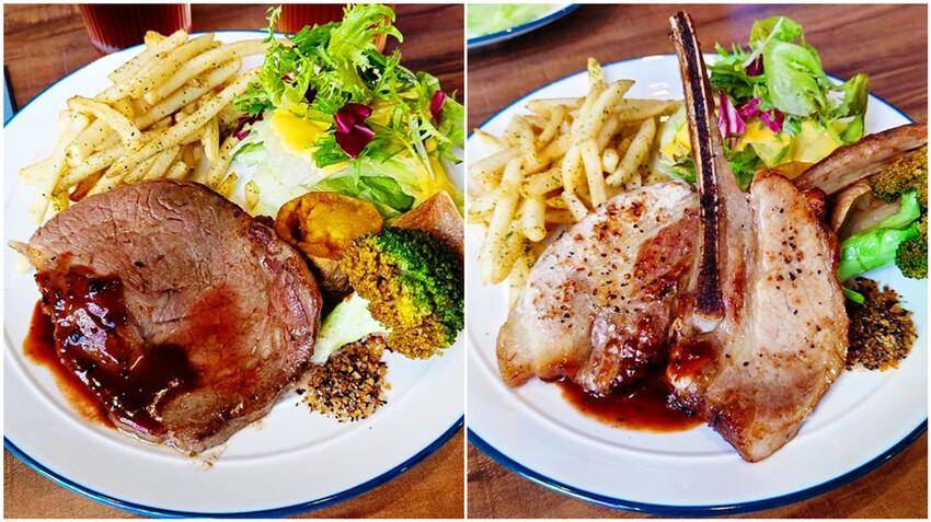 沙朗牛煎得軟嫩,豬肋排看起來比較像是戰斧豬排,味道也不賴