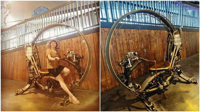 除了天花板懸吊著的飛機,突出半截的汽車頭,竟然還有這個讓人雙眼放光的圓形摩托車