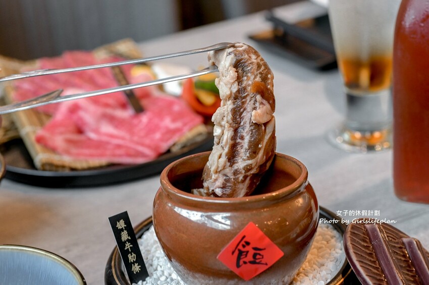 將醃漬過的牛肋條用罈裝,超級可愛又好拍,用剪刀剪出一大口小,烤過後每一口都超多汁也很有韌性,滋味甜中帶鹹,超級好吃。