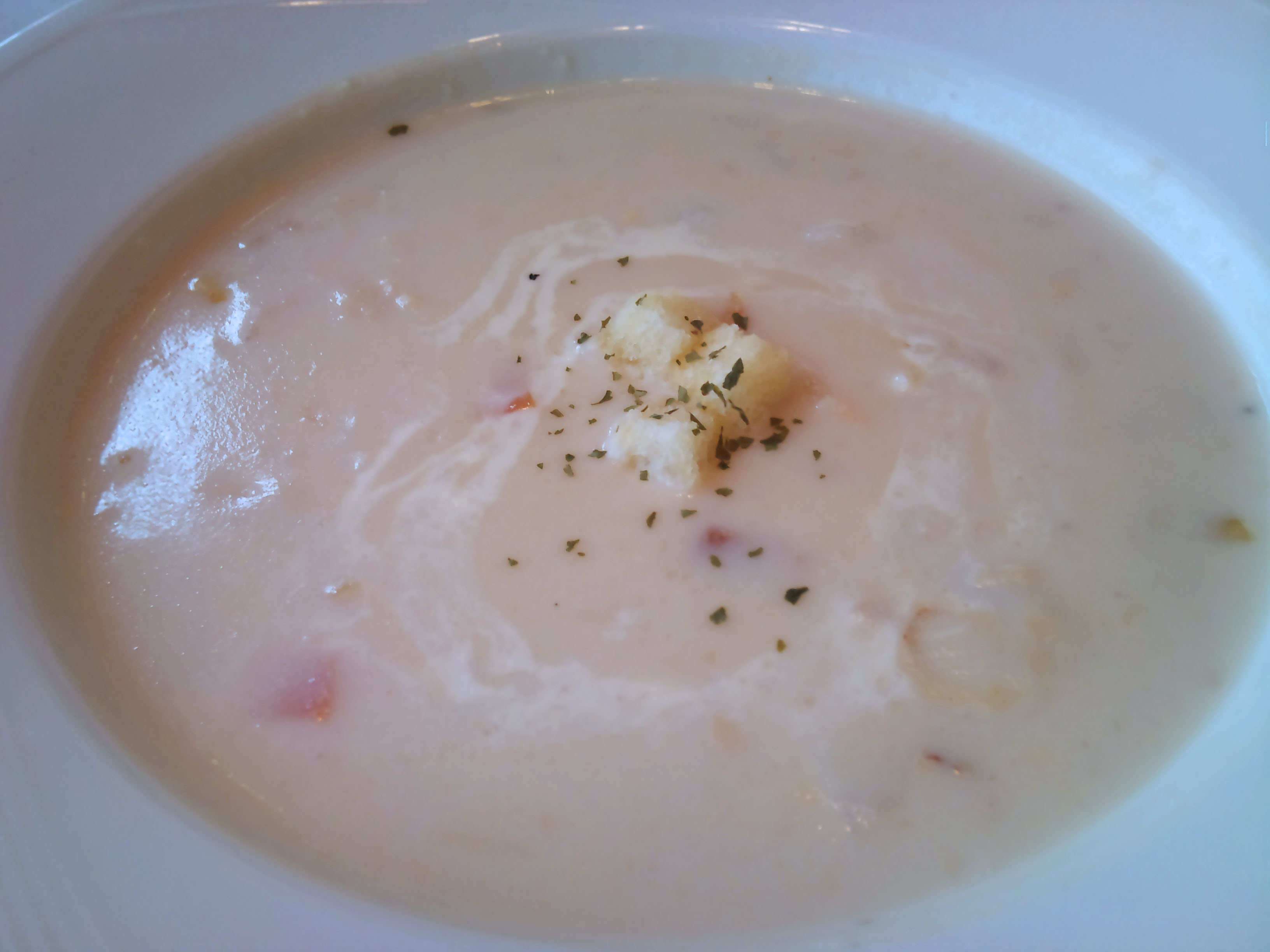 服務人員說,這道湯的工序相當繁複,為了把麵粉特有的豆腥味去除掉,主廚先將麵粉與無鹽奶油炒過後放進去烤,之後再以雞高湯為基底,加入馬鈴薯塊、培根...等食材,上桌前再灑上迷迭香裝飾也增添香氣~份量十足喔~
