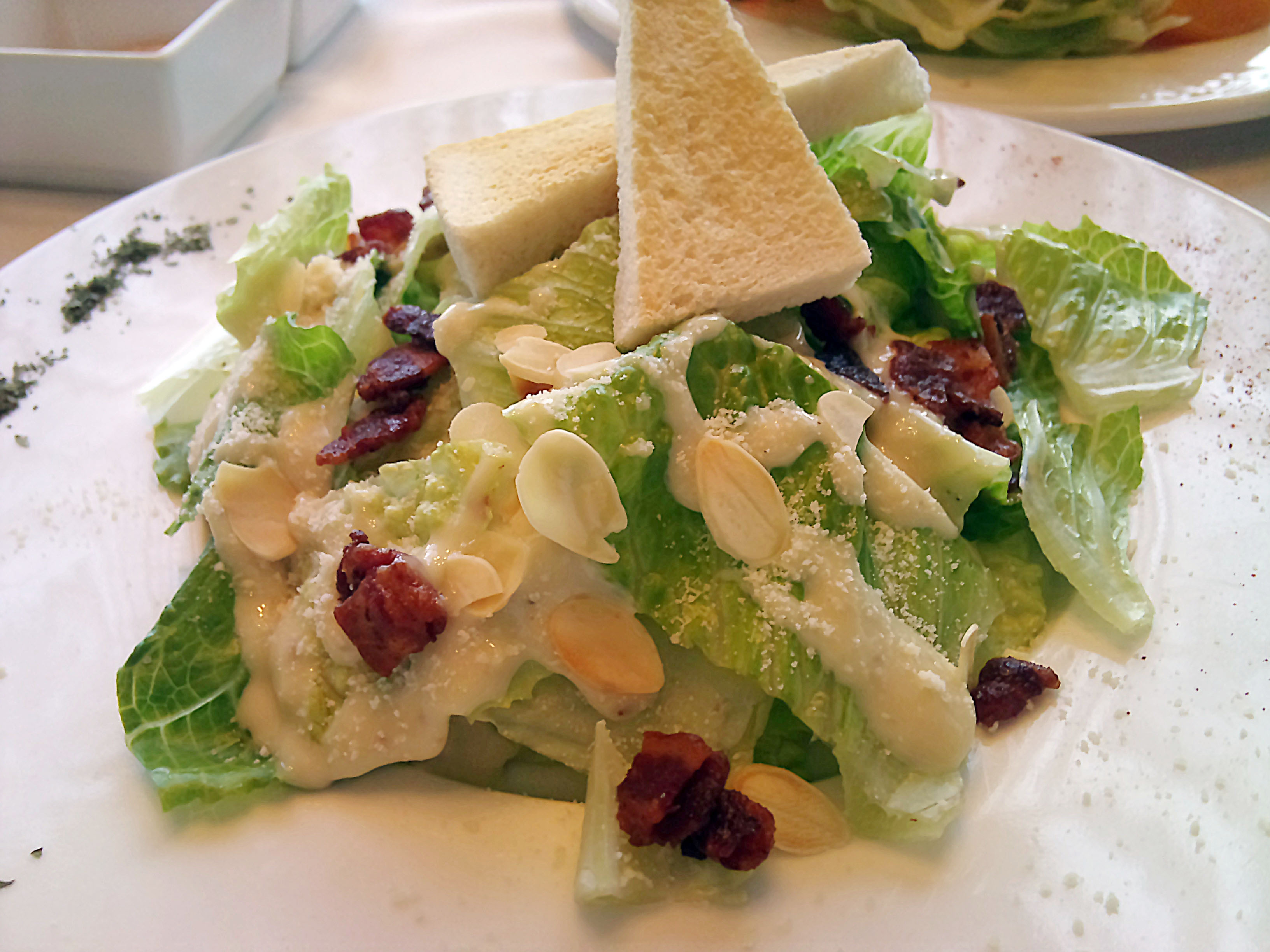 整個就是養生的路線~雖然是生菜沙拉,上面鋪上烤過的培根、杏仁片&兩小片烤土司,淋上凱薩醬之後再灑上帕馬森起司粉,超級合三毛的胃口的。
