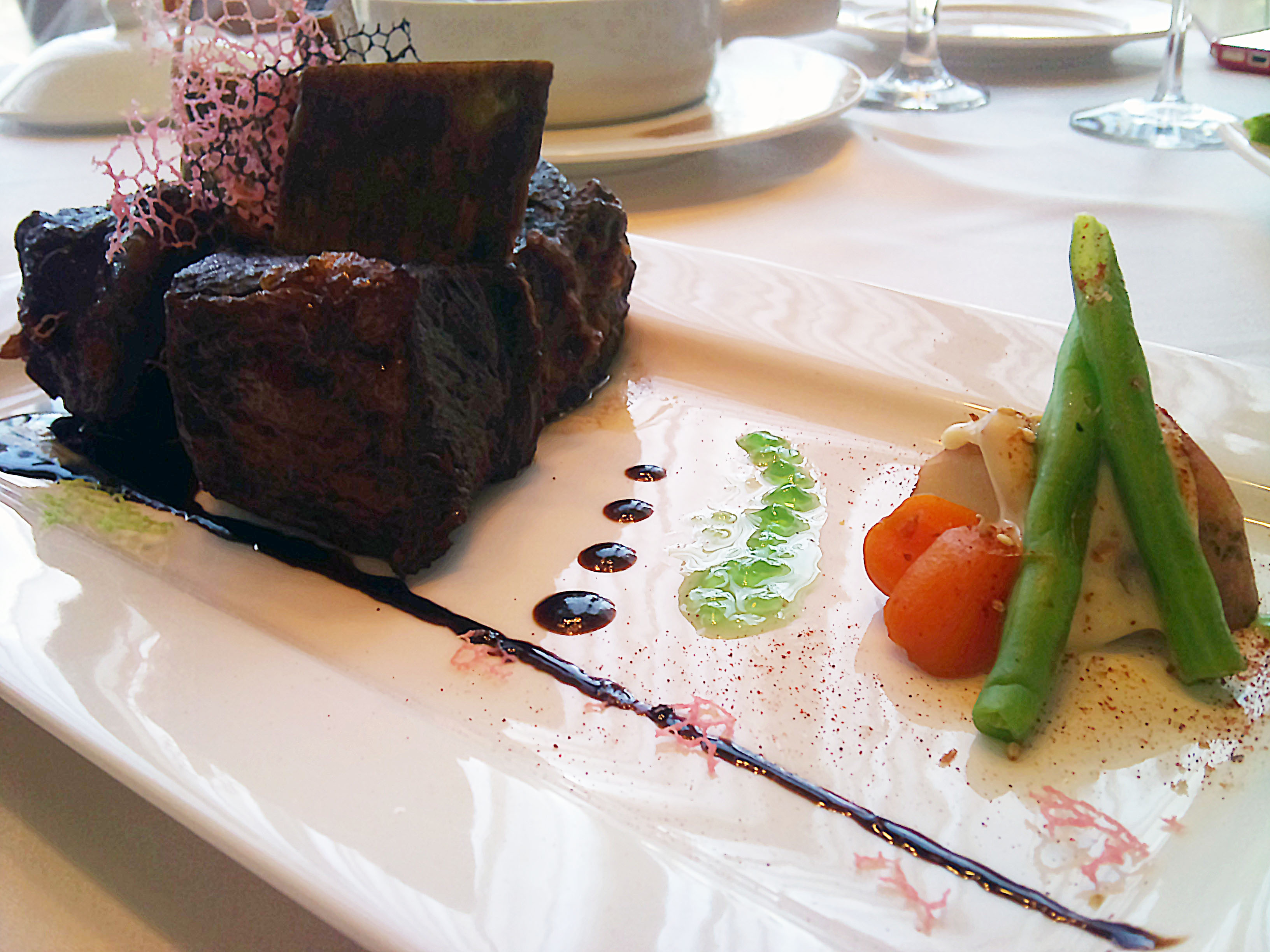 主廚說,研發這道菜主要是希望推廣紅酒與牛肉結合的美好。先將處理過後的帶骨牛小排以迷迭香&巴西里香料醃漬2天之後,再與紅酒一起燉煮至少1個小時後起鍋。就連醬汁都大有來頭,主廚用細碎牛肉加入紅酒及些許香料熬煮。厚實甜美的肉塊,沾著主廚精心調製的醬汁(就是盤子上的一點、一點的醬汁),超級搭的!!