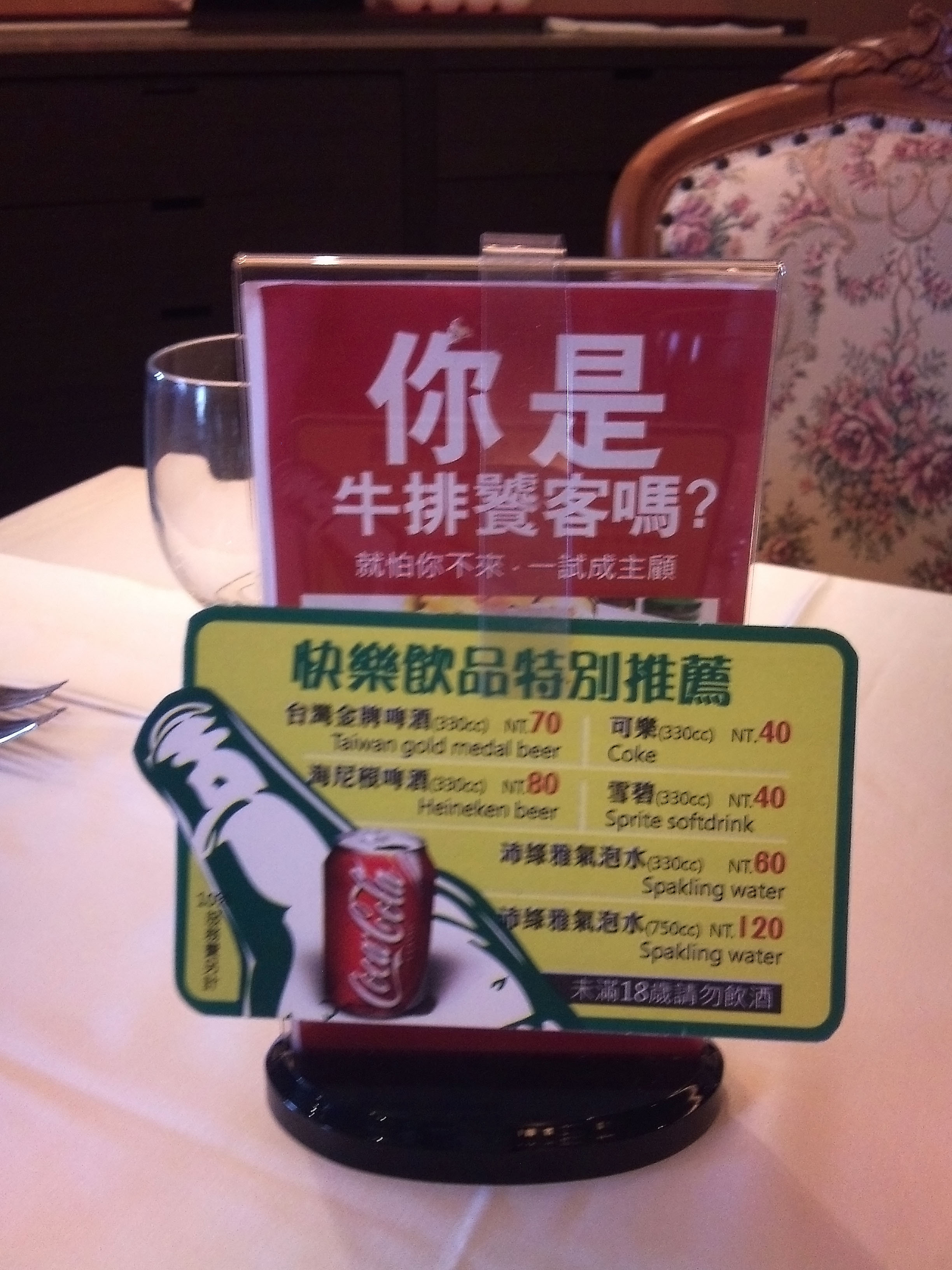 除了12盎司和24盎司的牛排,店裡還有歡迎超大胃王來點用36盎司,竟然還有96盎司!!!我看,那大概有兩個臉盆那麼大吧!!店內還舉辦超大盎司挑戰活動,1小時內把96盎司快樂大牛排吃完,就可以不用付錢耶!!服務生說,從推出到現在,目前有3個人挑戰大牛排,但是,不幸的是,目前成功計錄為0!!!廢話!!那麼大一客牛排,要小林鐏才吃得掉吧!!!
