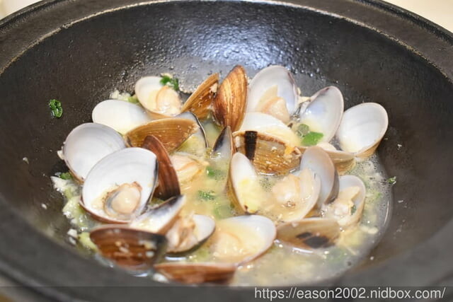 經過爆炒的蛤蜊鮮甜美味,搭上蒜香,風味更棒,如果擔心鍋物煮太久,會使蛤蜊縮水的話,可以先把蛤蜊拿起來,先嗑了,再加湯,也可以選擇一邊加湯,一邊享受蛤蜊的美味。