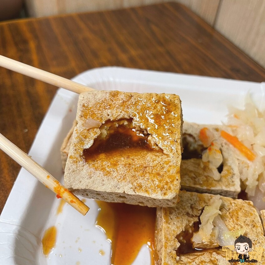 老闆會將臭豆腐挖一個洞,讓鹹甜帶蒜香的醬汁更入味,一咬下去還會有爆汁的爽感。