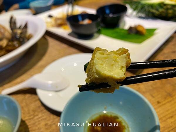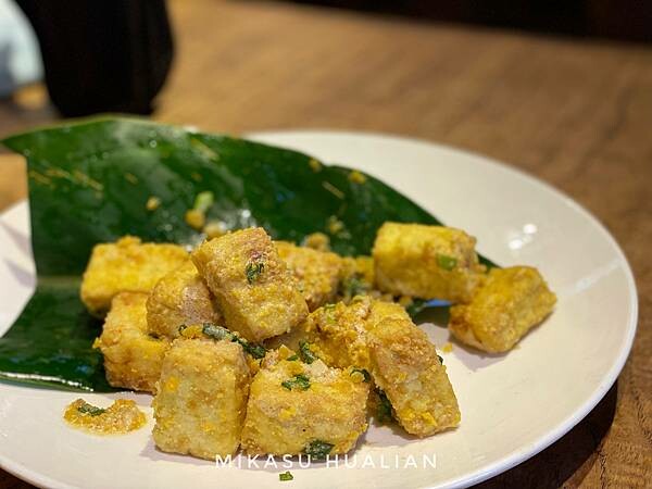 他們的金沙豆腐意外的還滿簡單的,只有放一片葉子裝飾,炸過的豆腐外面沾鹹蛋黃,再灑上一點蔥花,吃起來鹹香鹹香,鹹蛋黃包裹的很均勻、吃起來口味不會太膩,雖然上桌超燙,但是沒有人願意放棄吃熱熱的炸豆腐,一邊叫一邊吃(微笑)